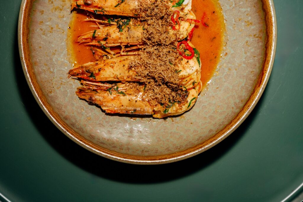 Στον τοίχο απέναντι από την κουζίνα, μια άλλη μεγάλη ταμπέλα γράφει “Please no dancing on tables”, για να αυτοαναιρεθεί με το μαθηματικό σύμβολο της δύναμης του 2 πάνω από το “no” υπονοώντας πως δυο αρνήσεις κάνουν μια κατάφαση. Απαγόρευση δεν υπάρχει λοιπόν. Δίπλα στην απαγόρευση που δεν είναι απαγόρευση, δύο πορτρέτα Φαγιούμ, στους άλλους τοίχους κάποιοι πίνακες με φλογερά χρώματα που έχει φτιάξει ο ίδιος. Εδώ, η διακόσμηση είναι ευκαιριακή, χωρίς σχέδιο και στόχο. Κάπως σαν τη γαστρονομική διάθεση του σεφ. Ρευστή, σχεδόν ενστικτώδης, μόνο που εδώ η τεχνική και η πολύχρονη εμπειρία λειτουργεί στον αυτόματο και παράγει πιάτα με υφές που ξαφνιάζουν και αρώματα εξωτικά και ελληνικά σε όμορφη ισορροπία που σε κάνουν να αγαπήσεις την κάψα που συχνά πυκνά σηκώνει κεφάλι. Κοινός παρανομαστής σε όλα, η φρεσκάδα και η φροντίδα για τα καλά υλικά, αναγνωρίσιμη παντού.
