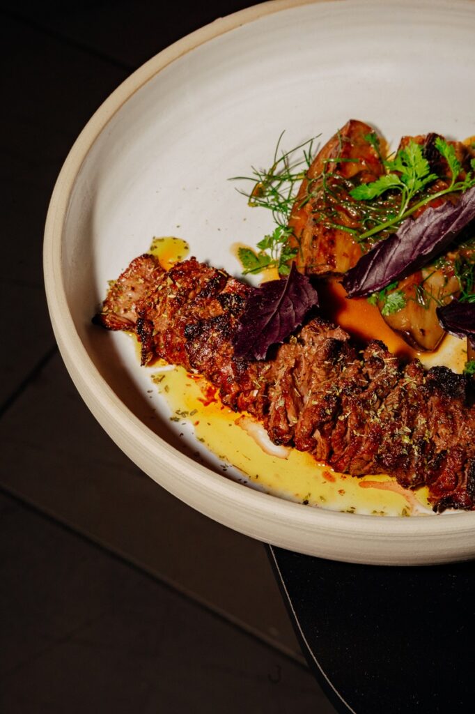 Στην αντίπερα γαστρονομική όχθη βρίσκεται το άλλο κυρίως πιάτο που απολαύσαμε, ένα ρουστίκ διάφραγμα στη ρομπάτα (η robata είναι ένα είδος γιαπωνέζικης ψησταριάς με κάρβουνα) με μελιτζάνα, σκόρδο και βασιλικό. Μεσογειακό κρεσέντο στα υλικά συν το ακαταμάχητο καπνιστό άρωμα και τη δαντελωτή υφή του κρεατικού.