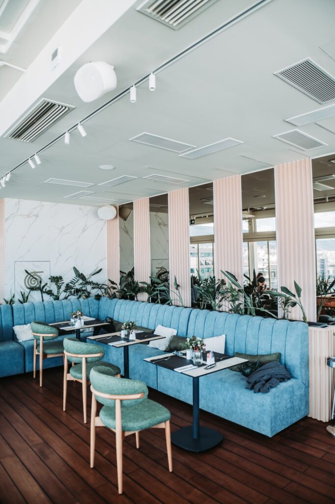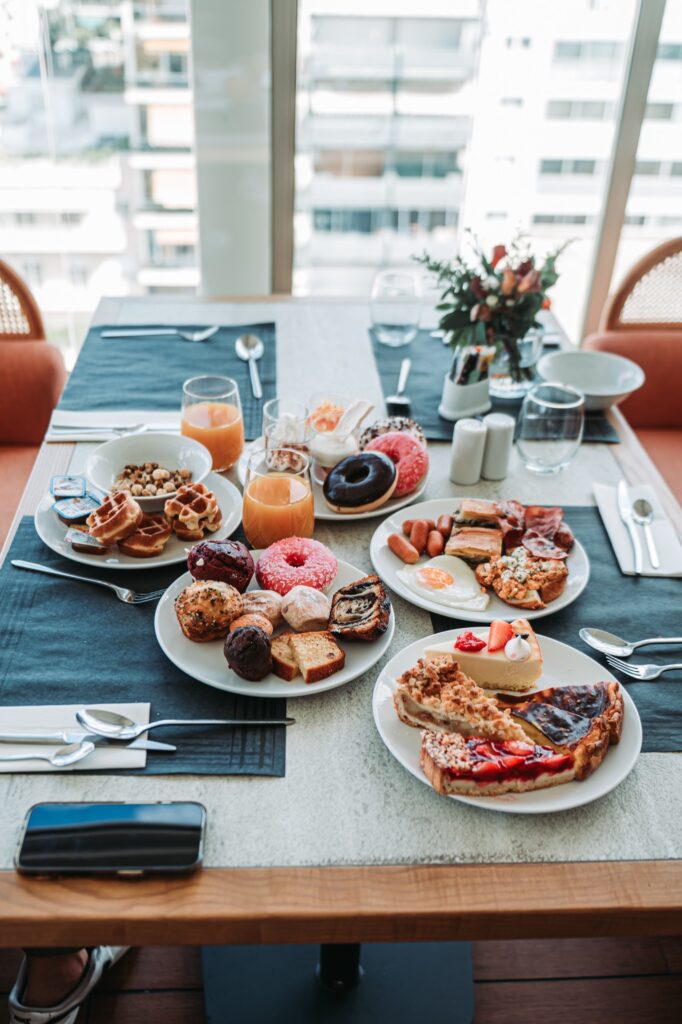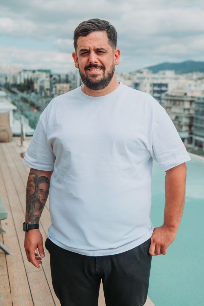Ανεβήκαμε Κυριακή πρωί και το φως έπεφτε ιδανικά πάνω στα τραπέζια. Η Αθήνα απλωνόταν μπροστά μας σαν χάρτης και ο χώρος -φωτεινός, ζεστός, με καθαρές γραμμές και διακριτική πολυτέλεια- έμοιαζε να σε προετοιμάζει για κάτι ωραίο, χωρίς υπερβολές. Ο μπουφές είχε ήδη αρχίσει να γεμίζει. Μυρωδιές από φούρνο, βούτυρο, αυγό και σοκολάτα δημιουργούσαν αυτό το γνώριμο comfort συναίσθημα που κάνει την Κυριακή να μοιάζει με μικρή γιορτή. Και κάπου εκεί, μας πλησίασε ο σεφ Δημήτρης Γεωργιάδης, ευγενικός, προσιτός, και με μάτια που έλαμπαν όταν μας μιλούσε για το brunch του.
