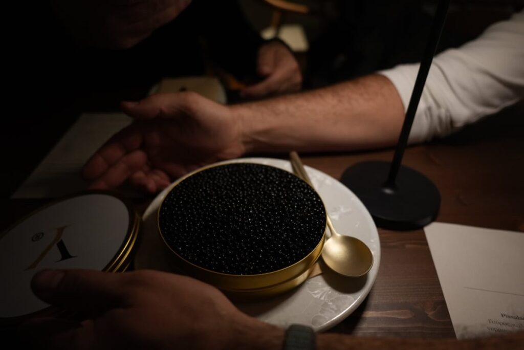 Ξεχωριστή παράγραφος αξίζει πιστεύω να γραφτεί για το γλυκό φινάλε που μας επιφύλαξε η ομάδα του Ydoron. Tο στρογγυλό κουτάκι σαν συσκευασία χαβιαριού έκρυβε μέσα του ένα crumble φουντουκιού στη βάση με σοκολάτα και καφέ, μια καραμέλα ουίσκι, μια γκανάζ πορτοκαλιού με σοκολάτα και όλη η σύνθεση ήταν σκεπασμένη με μικρές μαύρες μπίλιες σαν σε χαβιάρι. Μόνο που τα μικρά τραγανά μαύρα μπιλάκια περιείχαν στο εσωτερικό τους ένα κόρντιαλ από ουίσκι, καφέ και πορτοκάλι. Έξυπνο, ισορροπημένο, γευστικό και καλοδουλεμένο, μοντέρνο και κλασικό συνάμα το συνδυάσαμε με ένα Niepoort Porto 10 y Towny, που επέλεξε η sommelier του Ydoron, Ελευθέρια Αναστασιάδου.
