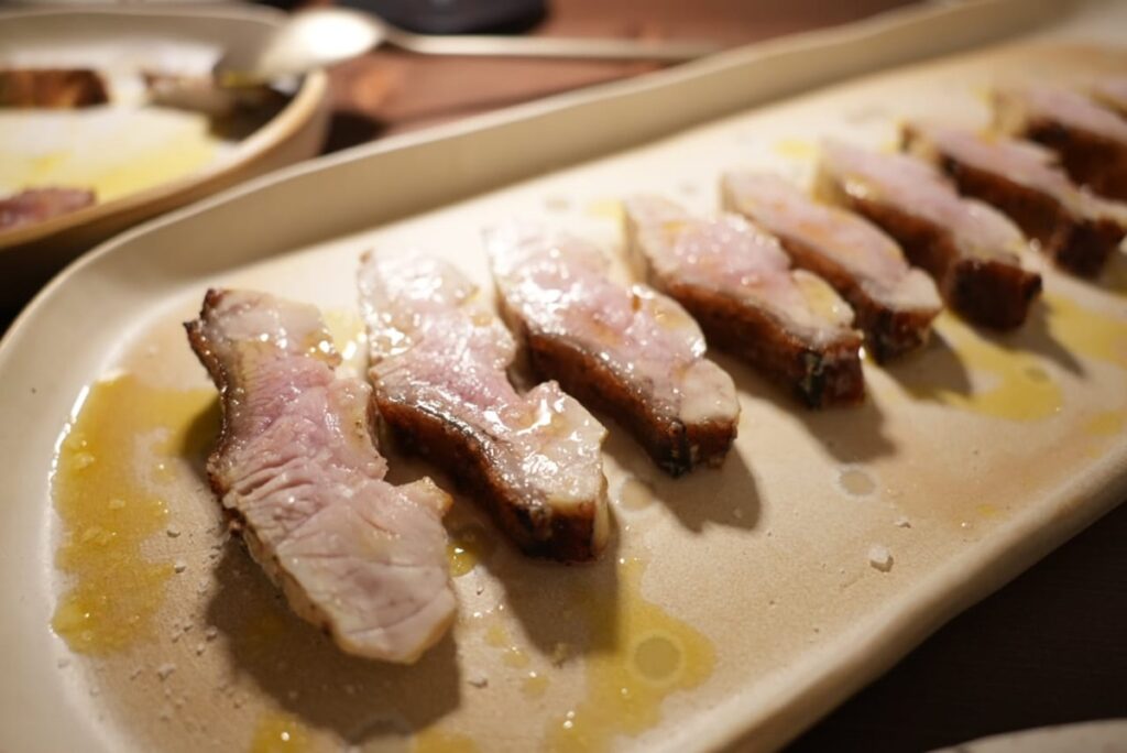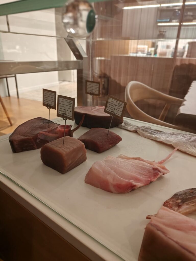 Όλες οι διαθέσιμες κοπές ψαριών έρχονται μπροστά σας σε μια ξεχωριστή κάρτα μαζί με το τρόλεϊ και τη ζωντανή παρουσίαση τους. Τσιπούρες και λαβράκια δεκαήμερης ωρίμασης γίνονται ταλιάτες, τόνοι και ξιφίες δημιουργούν bone in Rib eye και Striploin steaks. Εγώ όμως μπήκα στον πειρασμό και δοκίμασα ένα Flank steak κρανιού 10 ημερών, με απόλυτη επιτυχία στο ψήσιμο, ζουμερό με όμορφα στοιχεία από τα ξυλοκάρβουνα και διακριτικά αρτυμένο με εξαιρετικό παρθένο ελαιόλαδο και λεμόνι όπως και όλες οι κοπές, αλλά και μια εξαιρετική στηθοπλευρά από μια βλαχοσφυρίδα 35 κιλών και 18 ημέρων ωρίμασης. Λιπαρή στον πυρήνα της κρεάτινη και γεμάτη χυμούς με τραγανή και φουσκωμένη αλα πορκέτα πέτσα, ενθουσίασε άπαντες στο τραπέζι. Ποσοτικά έτρωγαν ανετά 3-4 άτομα και η τιμή της δεν ξεπερνούσε τα 100 ευρώ.