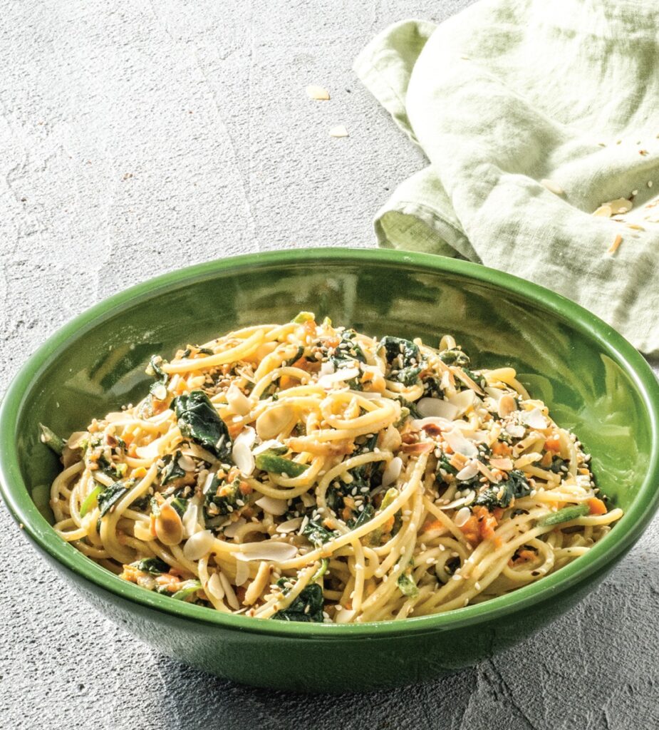 Μακαρονάδα με σπανάκι, ταχίνι και αμύγδαλα