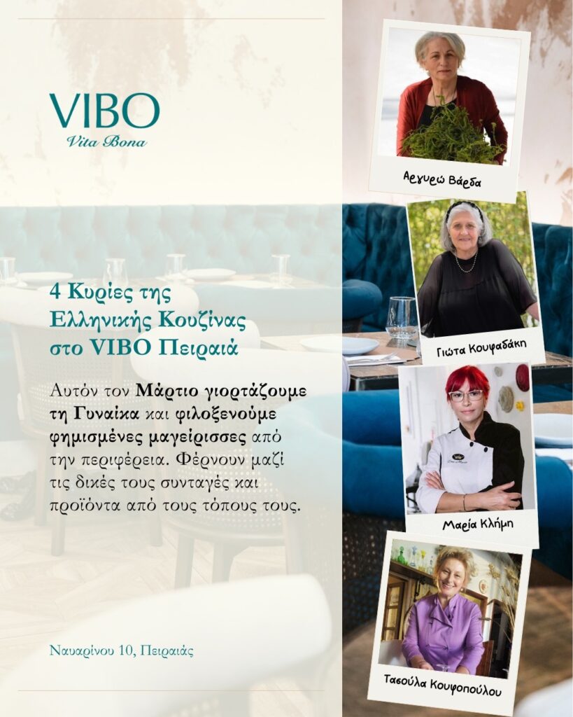 Υπάρχουν βραδιές που δεν είναι απλώς guest εμφανίσεις. Είναι μικρές μετακινήσεις τόπου. Τέτοιες ετοιμάζει το Vibo στον Πειραιά αυτόν τον Μάρτιο, δίνοντας την κουζίνα του σε τέσσερις γυναίκες που έχουν χτίσει τη δική τους γαστρονομική γλώσσα μακριά από το κέντρο.