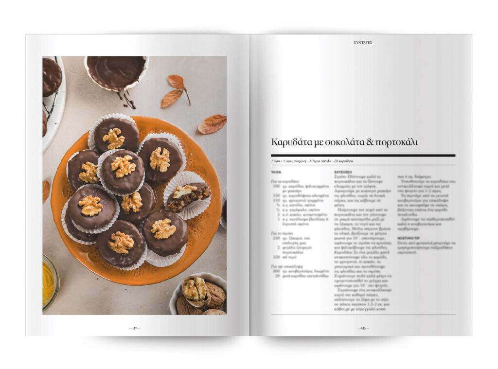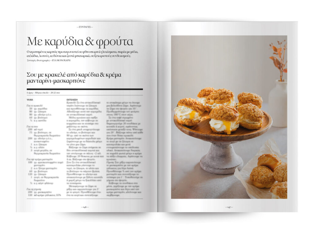 Σου με κρακελέ από καρύδια & κρέμα μανταρίνι-μασκαρπόνε, Κυδωνόπαστο με καρύδια, αρμπαρόριζα & πετιμέζι, Κέικ μελιού με ολόκληρα αχλάδια & αρωματικό σιρόπι, Καρυδάτα με σοκολάτα & πορτοκάλι, Κιουνεφέ με μήλα & καρύδια, Βουτυρένιες τάρτες με καρύδι & λωτό, Μους σοκολάτας με κόκκινο κρασί, κραμπλ καρύδι & ρόδι