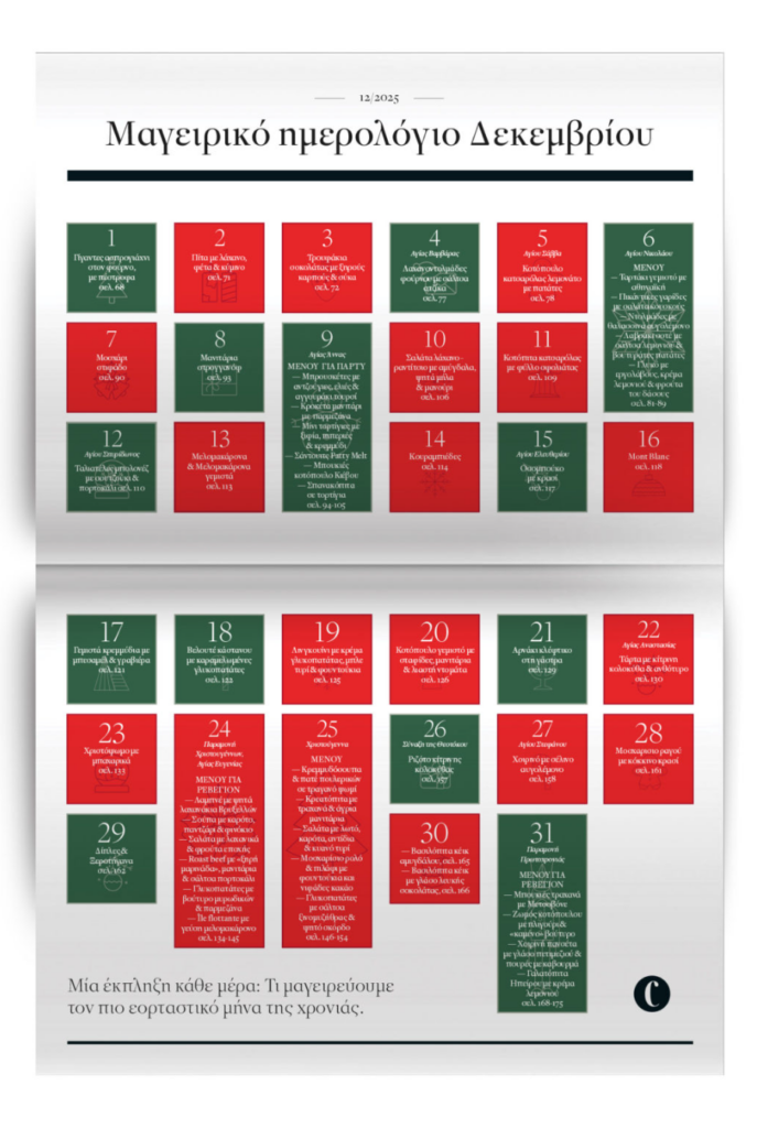 Αν κάτι αποτυπώνει αυτό το μαγειρικό ημερολόγιο, είναι η αίσθηση ότι οι γιορτές ξεκινούν πολύ πριν στρωθεί το τραπέζι. Ξεκινούν από την επιλογή των υλικών, την αναμονή που χτίζεται πάνω από μια κατσαρόλα και την ανυπομονησία για εκείνες τις στιγμές που όλοι συναντιούνται. Κι αυτό, τελικά, είναι η πραγματική γεύση του Δεκεμβρίου.
