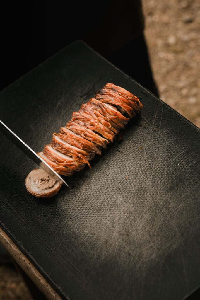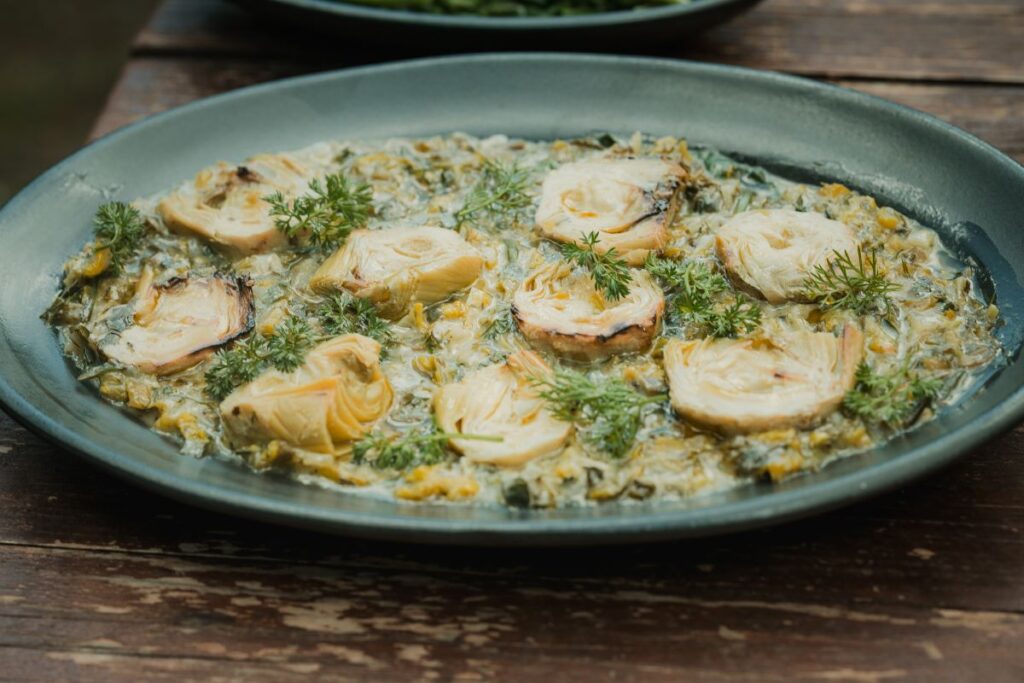 Εκεί, το τραπέζι δεν στήνεται βιαστικά. Απλώνεται σιγά, σχεδόν τελετουργικά. Μια σαλάτα με γλυκοπατάτες και φέτα Τραχειάς, άγρια σπαράγγια στη σχάρα, αγκινάρες φρικασέ, λαμπροκουλούρα, baby πατάτες με μυρωδικά. Και δίπλα τους, όλα όσα κάνουν το Πάσχα αυτό που είναι: γαρδουμπάκια στον φούρνο, αρνί στη σούβλα, κοκορέτσι που ψήνεται αργά, μέχρι να γίνει κομμάτι της ίδιας της στιγμής. Το γεύμα κλείνει γλυκά, με μια μπομπότα με σταφίδες και πορτοκάλι — ένα γλυκό που κουβαλάει την απλότητα και τη γενναιοδωρία της υπαίθρου.