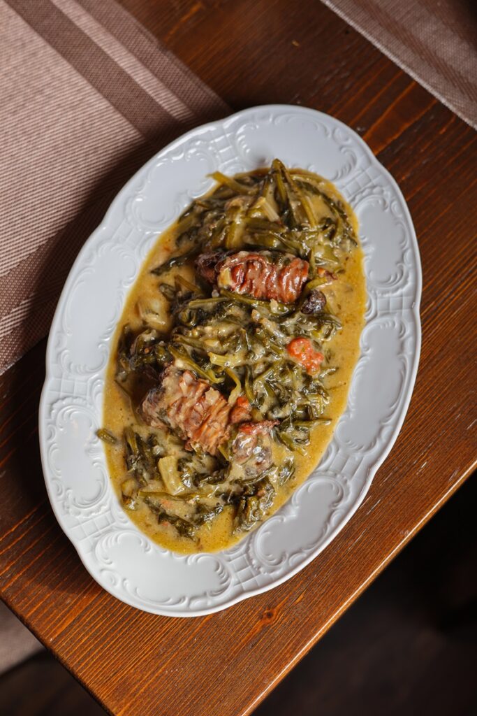 Έπρεπε το μενού να καλύπτει μια ευρεία γκάμα κρασιών χωρίς να χάνει την ουσία του και να γίνεται φλύαρο. Οπότε δημιούργησα ένα μενού βασισμένο σε αξίες: τοπικότητα, εποχικότητα, αγαπημένα πιάτα που κάτι σημαίνουν και όλα αυτά δεμένα αρμονικά με τα κρασιά. Γιατί μη ξεχνάμε: βρισκόμαστε σε οινοποιείο και όλα γυρίζουν γύρω από το κρασί. Έτσι βγήκε ένα μενού με καθαρές γραμμές, ξεκάθαρο μήνυμα και λόγο ύπαρξης, με πιάτα όπως η κρεατόπιτα με σάλτσα κρασιού, τα γαρδουμπάκια αυγολέμονο, ο τραχανάς με κρασάτα μάγουλα, τα μπουκατίνι με κεφτεδάκια, η τραγομακαρονάδα καπαμά, η οποία μπορεί να πει πολλά περισσότερα για την Ελλάδα από οποιοδήποτε tasting menu. Στο μενού επίσης βρίσκουμε, τηγανητή αγκινάρα με σκορδαλιά, το γεμιστό μήλο με ξηρούς καρπούς και σάλτσα καραμέλας και πάβλοβα με μανταρίνια.